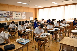 昼休みの2年1組の様子 昼休み終了10分前くらいに2年1組を覗いてみるとびっくりしました。なんと半分以上の人が座って勉強している!聞けば5限の社会で単元テストとのこと。その対策の勉強だったんですね。しっかりと準備した成果が結果につながるといいですね!