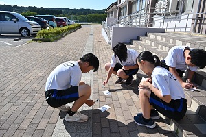 授業の様子~1年2組 理科~ 今日の1年2組の理科は凸レンズの性質についての学習でした。凸レンズとは光を一点に集めることのできる性質をもっており,その点を焦点といいます。生徒たちは凸レンズとコピー用紙を屋外に持ち出し,凸レンズで太陽光をコピー用紙上に集めました。太陽光が集まった焦点上では紙が焦げ,生徒たちは焦点の意味を実感をもって理解していました。