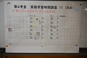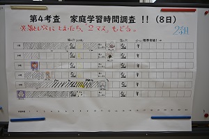 1年生 学習時間すごろく 1年生教室前のワークスペースに生活班ごとに学習時間の量を競う,すごろくが掲示されています。どの生活班もこのテスト期間で10時間前後の学習時間を達成しているようです。 人によって勉強をどのようにとらえるかは様々だと思いますが,「苦しいもの」,「辛いもの」,「面白くないもの」ととらえる人は少なくないでしょう。でも,そんな思いに向き合いながら努力を重ねた末に良い結果が出たとき,喜びだって格別です。そんなに遠くないテスト返しを思い浮かべ,残りのテスト期間を全力で勉強してほしいです。頑張れ南佐渡中生!