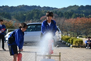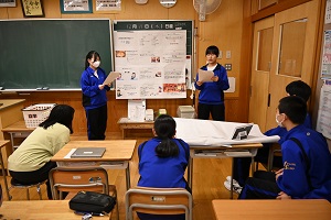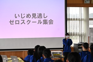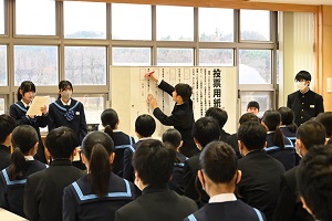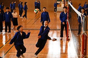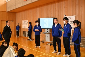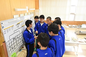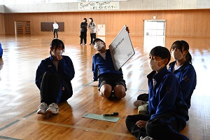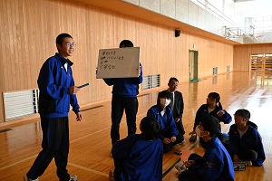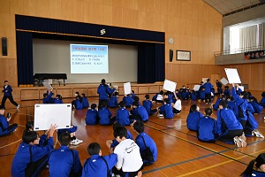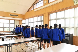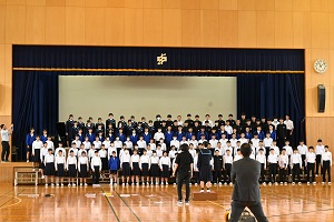 また,学活の後には体育祭の結団式が行われました。体育祭スローガンが発表されるとともに,赤,青の両軍に分かれて応援歌の練習が行われました。どちらの軍も大きな声で応援歌を歌い,結束を強めていました。