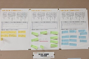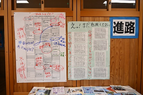 続いて1年生ワークスペースの掲示物です。2,3年生が1年生の入学を祝うメッセージポスターを作ってくれました。どのメッセージにも「一緒に頑張ろう」や「なんでも聞いてね」と本当に温かい言葉が並んでいて、1年生の不安な気持ちを和らげてくれたことと思います。仲間を温かく応援できるのが今の南佐渡中学校。そんな南佐渡中学校の生徒会のこれからが楽しみですね。
