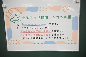 火曜日から元気アップ週間と題したキャンペーンが行われています。養護教諭A先生が企画したこのキャンペーンは,冬休みで乱れてしまったかもしれない生活リズムをなおし,良い学校生活を送ることができるようにとの思いを込められていて,生徒は毎朝iPadで前日の家での生活を振り返ることになっています。