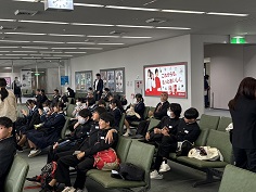 いよいよバスが到着。選手たちは自分のバッグをしっかりと持ち、バスの前に集まりました。バスの扉が開くと、どこか緊張した面持ちのまま、少しずつ乗り込んでいきます。窓の外には、朝の光が差し込み、出発の時が近づくにつれてその期待感が増していくのが感じられました。
