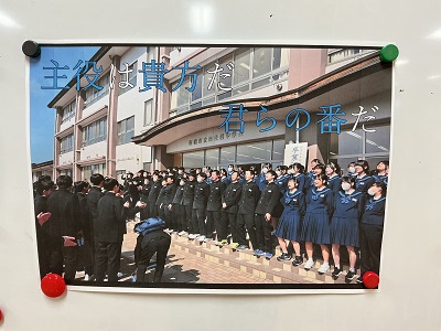 さて、2年生ワークスペースには写真のような掲示物が貼られていました。3年生が卒業した今、2年生が学校のリーダー。歴代の先輩からのバトンを受け継いだ今、南佐渡中を引っ張る自覚をもって過ごしていかなければいけないですね。