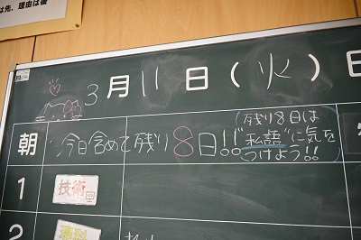 放課後に校舎を回っていたら、1年1組教室に素敵な黒板メッセージを発見しました。担任のI先生に聞くと、毎日1年1組の皆さんが書いてくれているとのこと。明日で3学期終業式まであと8日。今のクラスメイトと一緒の教室で過ごせるのもあと8日。残りの時間を惜しむようなメッセージに、1年の時間の重みを感じさせられました。